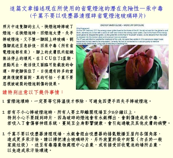 省電燈泡的潛在危險性非常重要請仔細看一看! 省電燈泡的潛在危險性非常重要請仔細看一看!汞中毒 照片中的人在換燈泡時,摔破了燈泡,不小心踩到,緊急送醫! 因汞中毒,腳上皮膚肌肉組織無法停止壞死。 請特別注意以下事項: